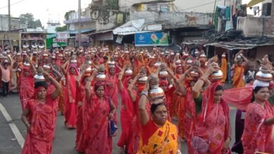 लाल पीली चुनरिया पहने 10108 नर्मदा कलश लेकर निकली मातृशक्ति