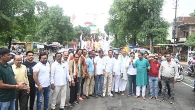 कांग्रेस पार्षद दल एवं शंकरशाह ब्लाॅक कमेटी के संयुक्त तत्वाधान में गौरीघाट रोड की खस्ता हालत के विरोध में निकाली बैलगाड़ी यात्रा