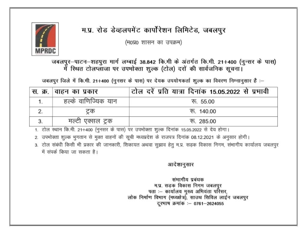 जबलपुर दर्पण पाटन ब्यूरो। जिला मुख्यालय से लगभग 10-12 किलोमीटर की दूरी पर जबलपुर से पाटन रोड पर टिमरी,बेनीखेड़ा में बने स्टेट हाइवे एमपीआरडीसी के टोल प्लाजा की एजेंसी एमपी.एसडी फोर्स प्राइवेट लिमिटेड नाके की शुरुवात हुए अभी सप्ताह भर भी नही हुआ और टोल कर्मों की अवैध वसूली चालू हो गई। 18 मई को लगभग 3.45 मिनिट पर वाहन क्र यूपी-42-बीटी-5056 का ड्राईवर जैसे ही टोल प्लाजा पर पहुंचा वैसे ही वाहन को बिना चैक करे उसकी हैवी वाहन की टोल पर्ची न 0000062 समय 15.24 मिनिट पर 140 रुपए वसूल कर लिए गए जबकि ड्राईवर टोल प्लाजा के कर्मचारियों को बताता रहा लेकिन उनके आगे ड्राईवर की एक नही चली। ड्राईवर को टोल प्लाजा कर्मी के अनुसार पैसा देना पड़ा। तभी टोल प्लाजा से गुजर रहे जबलपुर दर्पण के संवाददाता टोल प्लाजा कर्मी और ट्रक ड्राईवर के बीच विवाद होता देख रुक कर विवाद की जानकारी ली तो वाहन के ड्राईवर ने बताया कि टोल प्लाजा कर्मी द्वारा हैवी वाहन का शुल्क वसूला गया जबकि उक्त वाहन उस श्रेणी में नहीं आता गाड़ी के पेपर चैक करने के वाद टोल प्लाजा कर्मी ने अपनी गलती को मान कर ट्रक ड्राइवर का पैसा वापिस किया फिर टोल प्लाजा कर्मी द्वारा दूसरी पर्ची दी गई जिसका न 0000063 समय 15.27 मिनिट जब टोल कर्मी से टोल की परमिशन मांगी गई तो उनके द्वारा एमपीआरडीसी का बिना सील एव बिना अधिकारी के हस्ताक्षर के लेटर दिखाया गया,संदेह होने पर एमपीआरडीसी जबलपुर ऑफिस कॉल किया गया लेकिन फोन नही उठा। वही जब टोल प्लाजा कर्मी के आईडी कार्ड चैक किए गए तो उन पर भी न कर्मी की फोटो थी न उक्त कंपनी की सील और हस्ताक्षर थे। सारी घटना को देखते हुए उक्त टोल संदेह के घेरे में है कही एमपीआरडीसी तो फर्जी तरीके से एजेंसी के माध्यम से अवैध वसूली तो नही करा रहे है। जिला प्रशासन से ग्रामीणों की मांग है रोड़ किनारे टेंट लगा कर उक्त टोल संचालित करने वाली एजेंसी की जांच करे यह टोल प्रशासन के निर्देश पर ही संचालित हो रहा है तो कम्पनी को निर्देश दे की वाहनों से अवैध वसूली न करे यदि ऐसा करते हुए पाय जाते है तो उन पर सक्त कार्यवाही करे। यदि यह टोल शासन के बिना निर्देश के संचालित हो रहा है तो उन सभी दोषियों पर तत्काल कार्यवाही होना चाहिए।