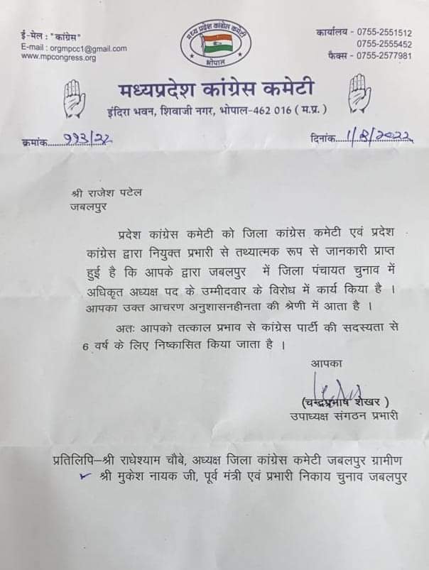 विधायक की शिकायत एव कांग्रेस पार्टी के ईमानदार कर्मठ कार्यकर्ता से मिली शिकायत को आधार मानकर प्रदेश कांग्रेस कमेटी को जिला कांग्रेस कमेटी एवं प्रदेश कांग्रेस द्वारा नियुक्त प्रभारी से तथ्यात्मक रूप से जानकारी प्राप्त हुई है कि पूर्व जिला पंचायत अध्यक्ष राजेश पटेल द्वारा जबलपुर में जिला पंचायत चुनाव में अधिकृत अध्यक्ष पद के उम्मीदवार के विरोध में कार्य किया है। उक्त आचरण अनुशासनहीनता की श्रेणी में आता है। राजेश पटेल को तत्काल प्रभाव से कांग्रेस पार्टी की सदस्यता से 6 वर्ष के लिए निष्कासित किया जाता है