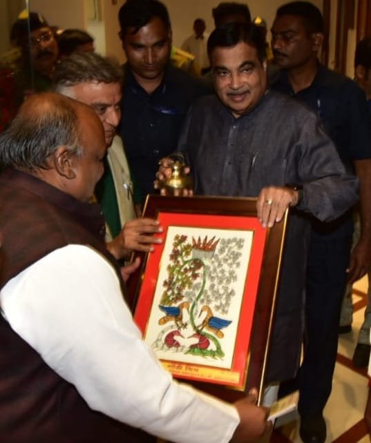 भाजपा व्यापारी प्रकोष्ठ के प्रदेश संयोजक शरद अग्रवाल ने नितिन गडकरी को गोंडी चित्र की पेंटिंग भेंट