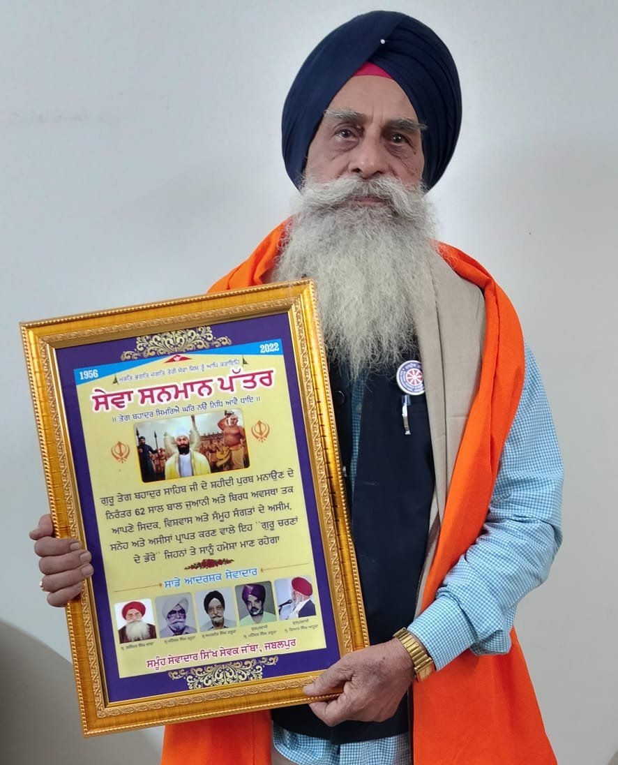 जबलपुर दर्पण। जबलपुर सिख समाज द्वारा गुरुद्वारा प्रेम नगर में सिख सेवक जत्था के संस्थापक एवं अध्यक्ष सरदार गजेंद्र सिंह बंगा, अमरजीत सिंह तलूजा , महेंद्र सिंह खनूजा एवं मरणोपरांत स्वर्गीय ज्ञान सिंह आहूजा एवं स्वर्गीय महेंद्र सिंह तलूजा को सेवा सम्मान से अलंकृत किया गया। इन्हें अभिनंदन पत्र शाल एवं सिरोपा प्रदान किया गया । ज्ञात हो कि सिख सेवक जत्था विगत 62 वर्षों से राष्ट्रीयस्तर के विश्वविख्यात रागी जत्थे ,प्रचारक ,कविगण एवं आर्टिस्ट आदि बुलाकर संस्कारधानी में श्री गुरु तेग बहादुर जी शहीदी दिवस का आयोजन लगातार करता चला आ रहा है । इस मौके पर श्री बांगा ने युवा पीढ़ी हेतु अपने पद का त्याग किया एवं मनमोहन सिंह सलूजा को प्रधान एवं अवतार बांगा व रविंद्र सिंह चाना को उपाध्यक्ष, मनप्रीत सिंह आहूजा मिक्की को महासचिव परमजीत सिंह छाबड़ा को सह सचिव तथा रविंदर सिंह दुआ को कोषाध्यक्ष जगजीत सिंह आहूजा को सह कोषाध्यक्ष मनोनीत किया ।