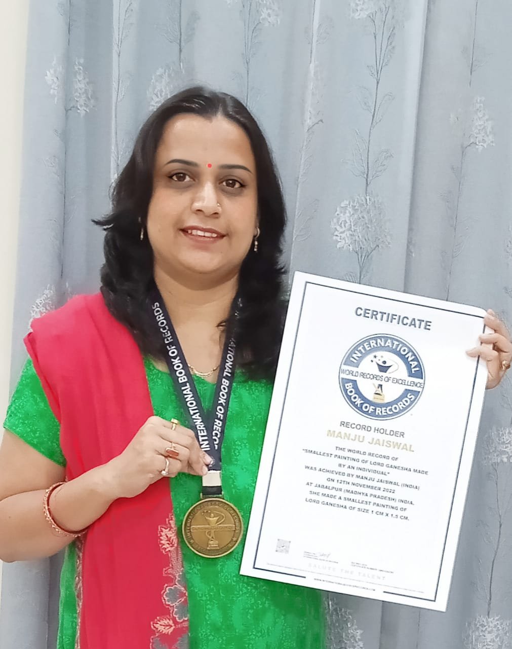 जबलपुर दर्पण। कला के क्षेत्र में राष्ट्रीय तथा अंतर्राष्ट्रीय स्तर पर परचम लहराने वाली कलाकार मंजू जायसवाल का नाम इंटरनेशनल बुक ऑफ रिकॉर्ड में दर्ज किया गया है |इन्होंने सबसे छोटे साइज 1 सेंटीमीटर 1.5 सेंटीमीटर के गणेश जी की पेंटिंग बनाकर अपनी प्रतिभा का अद्भुत प्रदर्शन किया है |श्रीमती मंजू ने पेंटिंग का कभी कोई कोर्स नहीं किया |वे स्वप्रेरणा से अलग-अलग ऑब्जेक्ट्स जैसे – मग, दीवार ,कैनवास ,कद्दू के बीज, जूट के थैले आदि में अपनी प्रतिभा के रंग बिखेरती हैं |इंटरनेशनल बुक ऑफ रिकॉर्ड में श्रीमती मंजू का नाम दर्ज होने से संस्कारधानी गौरवान्वित है |इसका श्रेय वे अपने माता-पिता और पति अंचल चौकसे को देती हैं | इस अवसर पर प्रसंग संस्था के संस्थापक इंजी. विनोद नयन डॉ मकबूल अली, निर्मला तिवारी निरंजन द्विवेदी, अंबर जादौन, बसंत शरमा, दुर्गा सिंह पटेल, राजेश लखेरा, कविता राय, डॉक्टर प्रतिभा पटेल आदि ने इस सम्मान पर शुभकामनाएं एवं बधाई प्रेषित की।