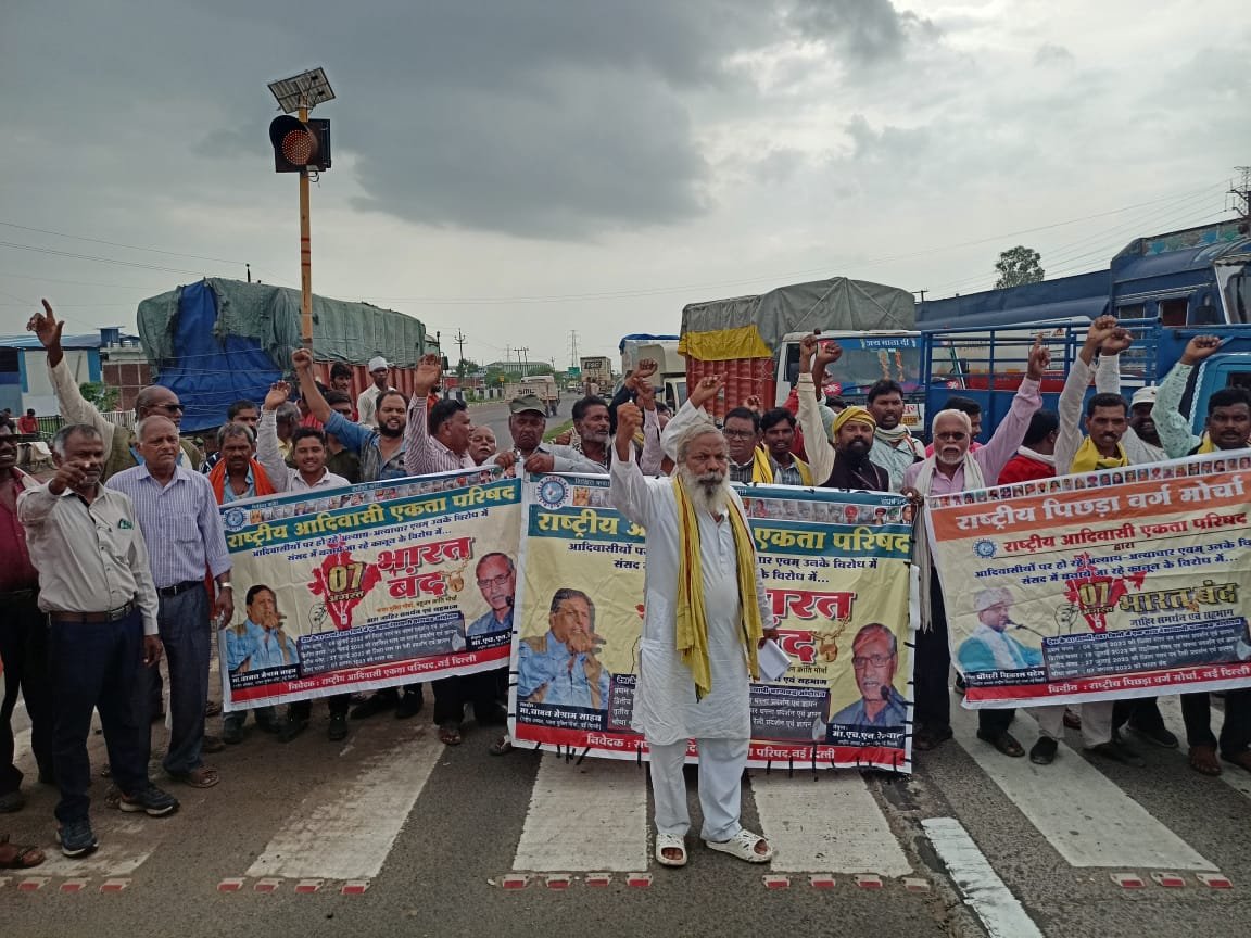 जबलपुर दर्पण। राष्ट्रीय आदिवासी एकता परिषद द्वारा यूनिफॉर्म सिविल कोड(समान नागरिक संहिता) के विरोध में नेशनल हाईवे NH 30 पर आज किया भारत बंद जबलपुर में खजरी खिरिया बाईपास पर चक्का जाम कर 2 घंटे रोड प्रदर्शन करते हुए जोरदार नारों के साथ जबलपुर से भेड़ाघाट बायपास तक नेशनल हाईवे की रोड जाम की गई, यूनिफॉर्म सिविल कोड के विरोध में राष्ट्रीय आदिवासी एकता परिषद द्वारा घोषित 7 अगस्त भारत बंद आंदोलन के अंतिम चरण में NH 30 हाई वे जाम किया गया जिससे खजरी खिरिया बायपास से भेड़ाघाट बायपास तक लम्बा जाम लग गया, यूनिफॉर्म सिविल कोड (समान नागरिक संहिता), वन संरक्षण संशोधन अधिनयम 2023 के विरोध ने नेशन,मणिपुर राज्य लगातार हो रही कुकी आदिवासियों पर हो रही हिंसा एवं बलात्कार , भारत में लगातार हो रहे आदिवासियों के विस्थापन आरएसएस द्वारा डिलिस्टिंग करवाकर आदिवासियों के विभाजन के साथ जबरन हिंदू बनाने के षड्यंत्र ,जड़मूल से रहने वाले आदिवासियों के गांवों को रेवेन्यू विलेज यानी राजस्व ग्राम का दर्जा आजादी के 75 वर्षों के बाद भी प्रदान नही किया गया है एक सु नियोजित षड्यंत्र अतिक्रमण के नाम पर जंगली क्षेत्रों में रहने वाले आदिवासियों को वन विभाग के द्वारा लगातार विस्थापित किया जा रहा ,विरोध में व अन्य 22 मांगों को लेकर सभी आदिवासी संगठनों के कार्यकर्ताओं से , ओबीसी एसटी एससी एवं माइनोरिटी के संविधान वादी संगठनों के कार्यकर्ताओं ने किया मान सिंह टेकाम जिला प्रभारी , प्रभु पेंद्रो, नारायण उईके , मंगल गोंड , भोले मदधू (गढ़ा) मरावी, किशोरी पेंद्रो , देव इरकिरा राष्ट्रीय आदिवासी एकता परिषद,इंजीनियर प्रवीण गजभिए बहुजन क्रांति मोर्चा, रामराज पटेल राष्ट्रीय पिछड़ा वर्ग मोर्चा , विनय भगत , छोटे भाई कुर्मी , सुखराम लोधी ,विजय लोधी , संजेश यादव, रमन पटेल देवकरण कुशवाहा लायर्स फोरम से एड त्रिलोक सोनकर , एड रवि भगत आदि के साथ अरविंद बिरहा राकेश नेताम , राम पेंड्रा ,राजेश धुर्वे , सूरज टेकाम, रोहित, दीपक, राजकुमार पेंड्रा, शिव प्रजापति, दोजीलाल प्रजापति , आर के महाजन, मंजीत चढ़ार, चंद्र विकास कुर्मी, मोहित पटेल, गिरिश मराठा, द्वारा 2 घंटे NH 30 जाम कर ज्ञापन दिया गया है।