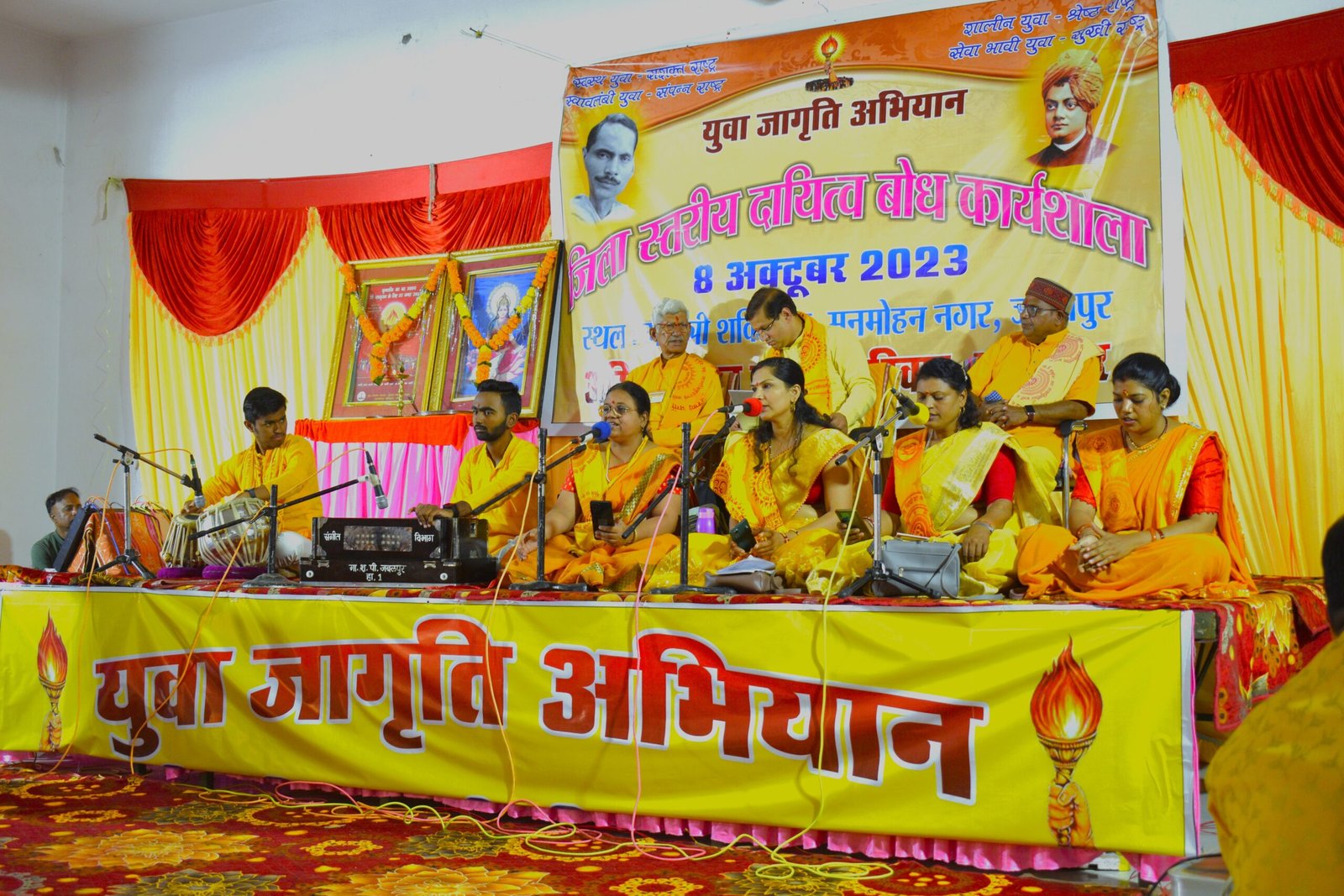 वॉइस ऑफ प्रज्ञा टीम की श्रीमती दीप्ति मिश्रा, ममता चोरे श्रीमती शारदा राय, संध्या बर्मन देव प्रभाकर बर्मन, सौरभ एवं उनकी टीम के द्वारा वंदना गीत एवं युवा जागरण गीत प्रस्तुत किए गए।