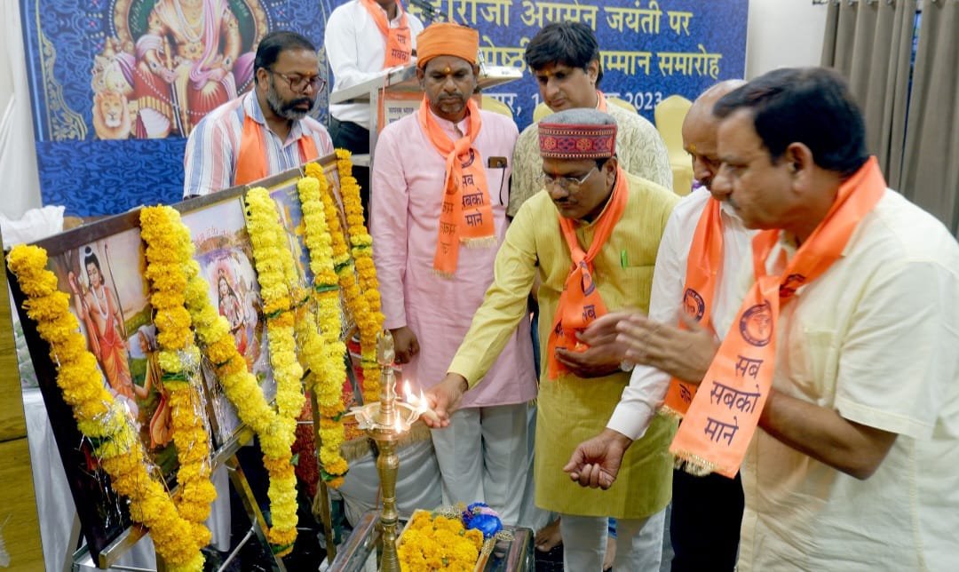 जबलपुर दर्पण। समरसता सेवा संगठन द्वारा महाराजा अग्रसेन जी की जन्मजयंती की पूर्व संध्या पर विचार गोष्ठी एवँ सम्मान समारोह का आयोजन मुख्य अतिथि प्रो.कौशल दुबे, मुख्य वक्ता डॉ पवन स्थापक, अग्रवाल सभा के अध्यक्ष यतीश अग्रवाल, समरसता सेवा संगठन के अध्यक्ष संदीप जैन, सचिव उज्ज्वल पचौरी की उपस्थिति में शाही पैलेश बारातघर में किया गया।कार्यक्रम के मुख्य वक्ता डॉ पवन स्थापक ने विचार गोष्ठी को संबोधित करते हुए कहा महाराजा अग्रसेन जी सूर्यवंशी राजा थे और भगवान श्रीराम के पुत्र कुश जी के वंशज थे। अग्रसेन जी वित्त नीति के कुशल प्रबंधक थे ऐसा हम सभी ने पढ़ा और सुना है और तत्कालीन समय में देश राज्य की परिस्थिति रही होगी कि लोगो को एकसूत्र में जोड़ने के लिए एक पैसा और एक ईंट देने का आह्वान किया। जिस तरह आज सामाजिक समरसता की देश और दुनिया में महती आवश्यकता है वैसे ही राजा अग्रसेन के काल मे हर वर्ग उन्नति करे सभी समृद्ध रहे इस हेतु सभी को जोड़ने के लिए उन्होंने वित्त नीति को प्रबल किया।उन्होंने कहा महाराजा अग्रसेन ने अपने काल मे निश्चित रूप से रामराज लाने का प्रयास किया और उनके शासन में सुख और समृद्धि का वातावरण था माता लक्षमी उनकी आराध्यदेवी थी और आज उनके वंशज के रूप में अग्रवाल समाज के लोगो पर माता लक्ष्मी की कृपा आज भी बरसती है।