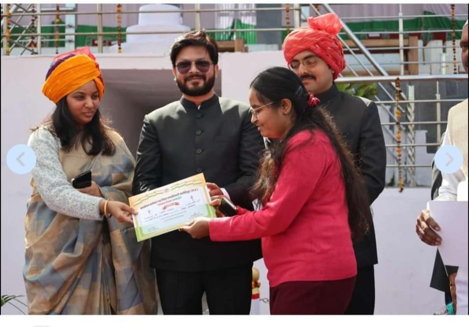 जबलपुर दर्पण। स्वामी विवेकानंद शास. स्नात्तकोत्तर महाविद्यालय नरसिंहपुर की राष्ट्रीय सेवा योजना छात्रा इकाई की होनहार स्वयं सेवक रागिनी डेहरिया ने 14वें राष्ट्रीय मतदाता दिवस के अवसर पर आयोजित निबंध प्रतियोगिता में मध्य प्रदेश में प्रथम स्थान प्राप्त किया। रागिनी डेहरिया को कुशाभाऊ ठाकरे अंतरराष्ट्रीय कन्वेंशन सेंटर भोपाल में पुरस्कार राशि एवं प्रशस्ति पत्र से सम्मानित किया गया। एवं नरसिंहपुर जिले के गणतंत्र दिवस समारोह में कलेक्टर महोदया द्वारा प्रशस्ति पत्र से सम्मानित किया गया। रागिनी की इस अभूतपूर्व उपलब्धि पर प्राचार्य डॉ. ममता शर्मा, राष्ट्रीय सेवा योजना छात्रा इकाई कार्यक्रम अधिकारी प्रो. ज्योत्स्ना झारिया, छात्र इकाई प्रभारी डॉ. जी. एस. मार्सकोले एवं शिखा वर्मा, देवांश पचौरी, राशिका चौरसिया, श्रुति गुप्ता, वेदांत दुबे, रौशनी चौधरी, ईशा राजपूत, रोहित मरकाम, निशा लोधी,दिव्या श्रीवास, सुहानी मेहरा आदि बड़ी संख्या में स्वयं सेवकों द्वारा बधाई एवं शुभकामनायें दी गईं।