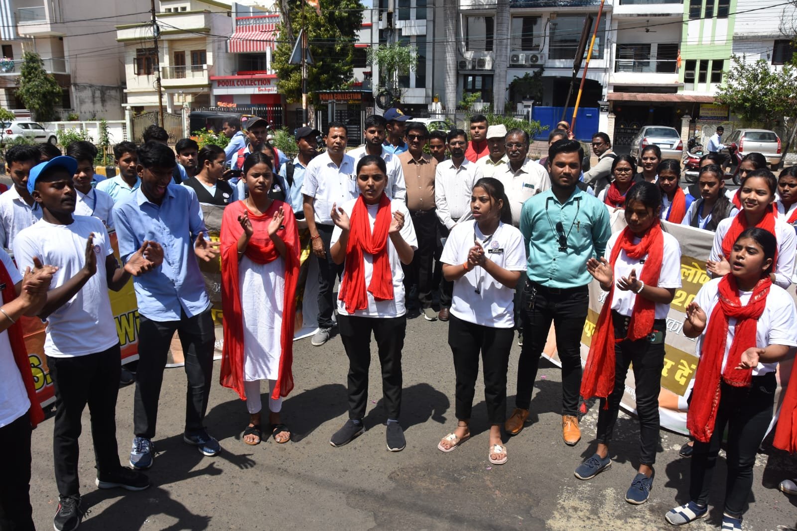 जबलपुर दर्पण। शासकीय महाकोशल कला एवं वाणिज्य स्वशासी महाविद्यालय, जबलपुर में स्वीप गतिविधियों के अंतर्गत महाविद्यालय के विद्यार्थियों द्वारा ”मतदाता जागरूकता नुकक्ड़ नाटक/ रैली“ महाविद्यालय से सांईबाबा मंदिर चौक, सिविल लाइन जबलपुर तक निकाली गई। जिसमें विद्यार्थियों द्वारा आमजनता को शत-प्रतिशत वोट डालने के लिए प्रेरित किया एवं जिसकी उम्र 18 वर्ष पूर्ण हो चुकी है वह अपने परिचन पत्र बनवाये एवं मतदान जरूर करने का संदेश दिया। सांईबाबा चौक पर विद्यार्थियों द्वारा नुकक्ड़ नाटक भी किया गया। जिसमें विद्यार्थियों द्वारा “सारे काम छोड़ दो, सबसे पहले वोट दो”, “हम सब ने यह ठाना है, वोट डालने जाना है”, ”बनो देश के भाग्य विधाता अब जागो प्यारे मतदाता“ आमजनता को संदेश दिया।