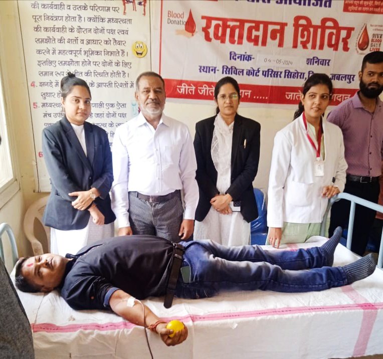 जबलपुर दर्पण। सिहोरा मीडिएशन भवन में विधिक सेवा समिति के द्वारा विधिक साक्षरता और रक्तदान शिविर का आयोजन किया गया। आयोजित शिविर में तहसील विधिक सेवा समिति के अध्यक्ष द्वितीय ऐडीजे सिहोरा माननीय सैफी दाऊदी सहित सभी न्यायाधीश की उपस्थिति में शिविर का आयोजन किया गया। शिविर में अलग-अलग वक्ताओं ने प्रताड़ित समाज के लोगों को कानूनी जानकारी से अवगत कराया। वहीं शिविर में पहुंचे करीब 16 रक्तदाताओं ने रक्तदान किया । रक्तदाताओं को फल, जूस, काफी, वितरण कर रक्तदान प्रमाण पत्र देकर सम्मानित किया गया।