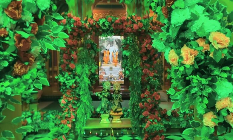 ठाकुर श्री आनंद बिहारी लाल जी महाराज सावबाबा मन्दिर में हरियाली तीज झूला दर्शन में फूल पत्ती डालियों और मनोहारी साज सज्जा कर भगवान के श्रीविग्रह की आरती पं गौरव तिवारी ने की।
