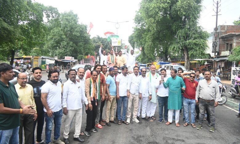 कांग्रेस पार्षद दल एवं शंकरशाह ब्लाॅक कमेटी के संयुक्त तत्वाधान में गौरीघाट रोड की खस्ता हालत के विरोध में निकाली बैलगाड़ी यात्रा
