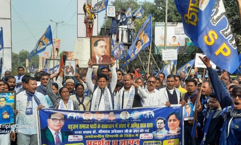 प्रदर्शन के दौरान बसपा कार्यकर्ताओं ने “अमित शाह मुर्दाबाद” और “अमित शाह माफी मांगो” जैसे नारे लगाए और केंद्रीय गृह मंत्री अमित शाह का पुतला फूंका।