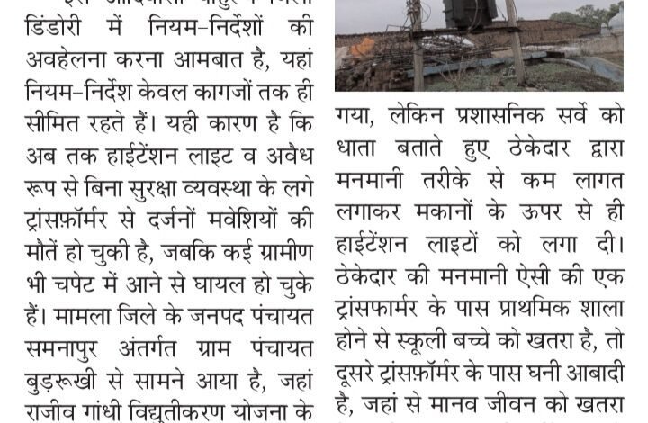 डिंडोरी, जबलपुर दर्पण ब्यूरो। आदिवासी बाहुल्य जिला डिंडोरी में नियम-निर्देशों की अवहेलना करना आमबात है, यहां नियम-निर्देश केवल कागजों तक ही सीमित हैं। यही कारण है कि अब तक हाईटेंशन लाइट व अवैध ढंग से बिना सुरक्षा व्यवस्था के लगे ट्रांसफ़ॉर्मर को अब तक नहीं हटाया जा रहा। ग्रामीणों की मानें तो दर्जनों मवेशियों की मौतें करंट की चपेट में आने से अब तक हो चुकी है, जबकि कई ग्रामीण भी तार की चपेट में आने से घायल हो चुके हैं। मामला जिले के जनपद पंचायत समनापुर अंतर्गत ग्राम पंचायत बुड़रूखी के आदिवासी मोहल्ले, वार्ड क्रमांक 08 से सामने आया है। बताया गया कि राजीव गांधी विद्युतीकरण योजना के तहत आदिवासी इलाके में करोड़ों रुपए खर्च करके लाइटें लगाई गई, जिसमें जमकर भ्रष्टाचार किया गया। गौरतलब है कि कुछ वर्ष पहले गांव के आदिवासी मोहल्ले में लाइट लगाने के लिए गांव से बाहर हाईटेंशन लाइट व ट्रांसफ़ॉर्मर लगाने के लिए सर्वे किया गया था, लेकिन प्रशासनिक सर्वे को धाता बताते हुए ठेकेदार ने मनमानी तरीके से कम लागत लगाकर मकानों के ऊपर से ही हाईटेंशन लाइटों को लगा दिया, जहां से अब जानमाल को खतरा बना हुआ है। बताया गया कि एक ट्रांसफार्मर के पास प्राथमिक शाला होने से स्कूली बच्चे को खतरा है, तो वहीं दूसरे ट्रांसफ़ॉर्मर के पास घनी आबादी है, जहां से मानव जीवन को खतरा बना रहता है। जर्जर खंभा, झूलती हाईटेंशन तारें कभी भी गिरने की सम्भावना है, बिना सुरक्षा व्यवस्था के झूलते तारों के गिरने से कभी भी बड़ी जनहानी हो सकती है। मामले को लेकर कई बार अखबारों के माध्यम से प्रशासनिक अधिकारियों के संज्ञान में आया गया, बावजूद कोई कार्रवाई नहीं हुई। स्थानीय लोगों ने जल्द से जल्द मामले में कार्रवाई करने की मांग की जा रही है।