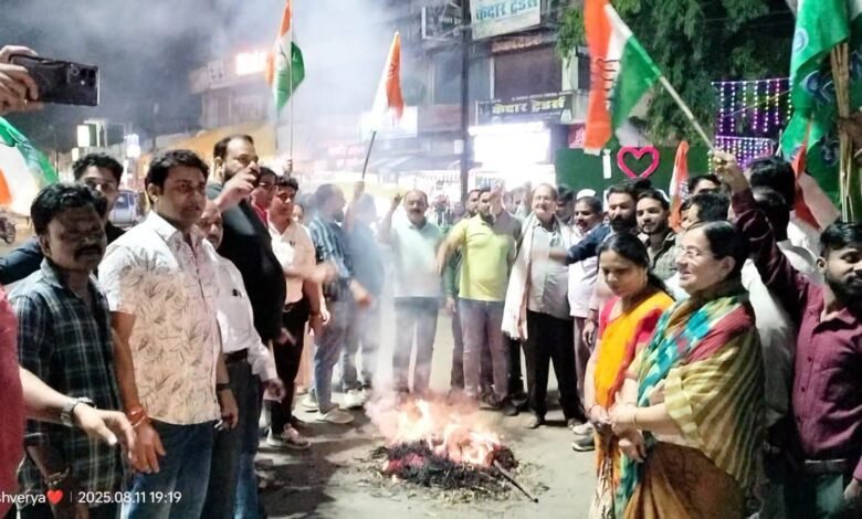 सिवनी जबलपुर दर्पण । चुनाव आयोग पर पक्षपात और विपक्षी नेताओं के खिलाफ कार्रवाई के आरोपों को लेकर कांग्रेस ने आज नगरपालिका सिवनी परिसर के सामने जोरदार विरोध प्रदर्शन किया। जिला कांग्रेस अध्यक्ष राजकुमार खुराना के नेतृत्व में कांग्रेस कार्यकर्ताओं ने मोदी सरकार और चुनाव आयोग के खिलाफ नारेबाजी करते हुए पुतला दहन किया।