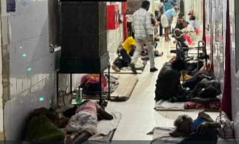 वार्डों में न पर्याप्त बेड हैं, न स्ट्रेचर। मरीजों को जमीन पर चादर बिछाकर इलाज कराना पड़ रहा है। अस्पताल परिसर में जगह-जगह मरीज और उनके परिजन बेसहारा पड़े रहते हैं।