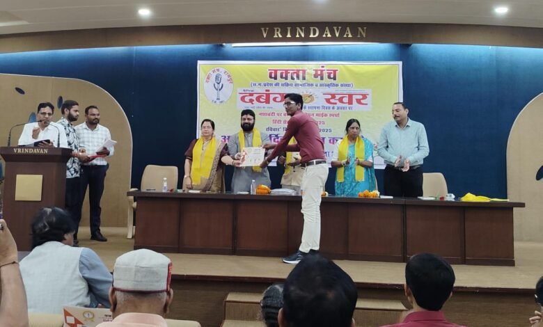 रायपुर जबलपुर दर्पण । वक्ता मंच (छत्तीसगढ़ प्रदेश की सामाजिक – साहित्यिक-सांस्कृतिक संस्था) एवं दैनिक दबंग स्वर के संयुक्त तत्वावधान में राजधानी रायपुर में रविवार(28 सितंबर) शाम को आयोजित हिंदी सेवा सम्मान – 2025 समारोह में रायपुर के साहित्यकार मुकेश कुमार सोनकर को सम्मानित किया गया। यह सम्मान उन्हें हिंदी भाषा के प्रति उनकी सृजनात्मक साहित्य साधना, प्रेरणादायी काव्यकृतियों और समाज में हिंदी के प्रचार प्रसार संबंधी उल्लेखनीय योगदान के लिए प्रदान किया गया। कार्यक्रम में मुख्य अतिथि के रूप में पं. पी. के. त्रिवेदी (प्रधान संपादक, दबंग स्वर), राजेश पराते(अध्यक्ष, वक्ता मंच) और शुभम साहू (संयोजक,वक्ता मंच) उपस्थित थे।