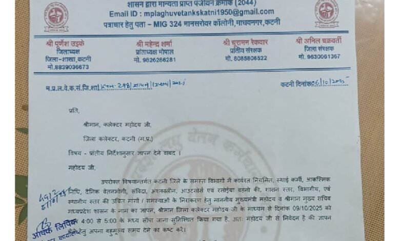 कटनी जबलपुर दर्पण । मध्य प्रदेश लघु वेतन कर्मचारी संघ जिला कटनी द्वारा कर्मचारियों की मांगों को शासन तक पहुँचाने के उद्देश्य से ज्ञापन सौंपा जाएगा। संघ के जिलाध्यक्ष पूर्णेश उइके एवं मीडिया प्रभारी अनिल पांडे ने प्रेस विज्ञप्ति जारी कर बताया कि संघ द्वारा समस्त विभागों में कार्यरत नियमित, आकस्मिक निधि, स्थाई कर्मी, दैनिक वेतन भोगी, अंशकालीन, आउटसोर्स कर्मचारी तथा रसोईया बहनों की समस्याओं और मांगों के निराकरण हेतु माननीय मुख्यमंत्री एवं मुख्य सचिव मध्य प्रदेश शासन भोपाल के नाम का ज्ञापन जिला कलेक्टर कटनी के माध्यम से सौंपा जाएगा।