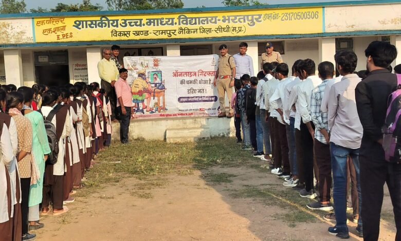 सीधी जबलपुर दर्पण । पुलिस मुख्यालय भोपाल द्वारा संचालित साइबर सुरक्षा जागरूकता अभियान के तहत सीधी पुलिस द्वारा जिले के विभिन्न क्षेत्रों में जनजागरूकता कार्यक्रम आयोजित किए जा रहे हैं। इस अभियान के अंतर्गत पुलिस अधीक्षक संतोष कोरी के निर्देशन, अतिरिक्त पुलिस अधीक्षक अरविंद श्रीवास्तव तथा एसडीओपी चुरहट, कुसमी आशुतोष द्विवेदी के मार्गदर्शन एवं थाना प्रभारी रामपुर नैकिन एवं कुसमी के नेतृत्व में साइबर अपराधों के प्रति जनजागरूकता हेतु विशेष कार्यक्रम आयोजित किए गए। पुलिस चौकी पिपरांव के प्रभारी उप निरीक्षक शेषमणि मिश्रा एवं पिपरांव पुलिस टीम द्वारा थाना रामपुर नैकिन अंतर्गत शासकीय उच्चतर माध्यमिक विद्यालय भरतपुर में साइबर जागरूकता कार्यक्रम आयोजित किया गया। इस दौरान विद्यार्थियों एवं शिक्षकों को साइबर अपराधों के प्रकार, ऑनलाइन ठगी एवं फाइनेंशियल फ्रॉड से बचाव के उपाय तथा सोशल मीडिया उपयोग में सावधानियां के बारे में विस्तारपूर्वक जानकारी दी गई। कार्यक्रम में विद्यालय के लगभग 200 विद्यार्थी एवं अध्यापकगण उपस्थित रहे। इसी क्रम में थाना प्रभारी कुसमी निरीक्षक अरुण द्विवेदी के नेतृत्व में ग्राम पंचायत रुन्दा में ग्रामीण जनों को साइबर अपराधों के बढ़ते मामलों के प्रति सचेत किया गया। ग्रामीणों को बताया गया कि अज्ञात लिंक, कॉल या संदेश पर अपनी निजी या बैंक संबंधी जानकारी साझा न करें तथा किसी भी संदिग्ध गतिविधि की सूचना तत्काल नजदीकी पुलिस थाने या साइबर हेल्पलाइन नंबर 1930 पर दें।