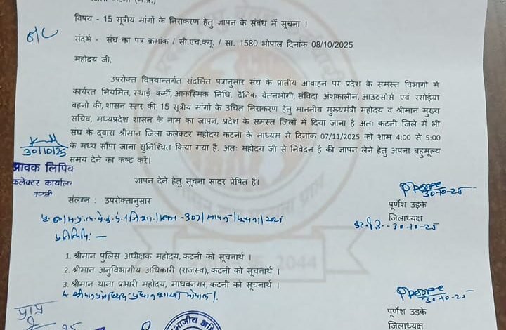 कटनी जबलपुर दर्पण । मध्य प्रदेश लघु वेतन कर्मचारी संघ, जिला कटनी के जिलाध्यक्ष पूर्णेश उइके एवं मीडिया प्रभारी अनिल पांडेय ने प्रेस विज्ञप्ति जारी कर जानकारी दी कि संघ के प्रांतीय आव्हान पर प्रदेशभर में 15 सूत्रीय मांगों के निराकरण हेतु ज्ञापन सौंपा जाएगा।इसी क्रम में कटनी जिले में 7 नवंबर 2025 को शाम 4 से 5 बजे के बीच, संघ के पदाधिकारी एवं सदस्य जिला कलेक्टर कटनी के माध्यम से ज्ञापन सौंपेंगे। यह ज्ञापन माननीय मुख्यमंत्री मध्यप्रदेश एवं मुख्य सचिव, मध्यप्रदेश शासन के नाम संबोधित होगा।संघ की प्रमुख मांगों में वेतन विसंगति दूर करने, पदोन्नति नीति में सुधार, सेवा स्थायीकरण, पेंशन योजना लागू करने, कार्यस्थल पर सुरक्षा, भत्तों में वृद्धि, एवं कार्य समय में लचीलापन जैसी मांगें शामिल हैं।जिलाध्यक्ष पूर्णेश उइके ने बताया कि संघ का उद्देश्य राज्य सरकार तक लघु वेतनभोगी कर्मचारियों की वास्तविक समस्याओं को पहुंचाना है ताकि लंबे समय से लंबित मुद्दों का समाधान हो सके।इस अवसर पर उपस्थित रहने और कार्यक्रम को सफल बनाने की अपील संघ के पदाधिकारियों अजय गौतम, मनोज श्रीवास, मनोज दहिया, सौरभ सिंह, धर्मेंद्र राज, राकेश जासूजा, हरीश बेन, अजीमुद्दीन शाह, नीलेश, शत्रुघन, ज्ञानेंद्र, कमलेश, सदानंद, रामनरेश यादव, रामावतार, तेजभान, हमीद खान, नकुल यादव, महेश अहीरवाल, सतीश पटेल, बलराम सिंह, शकुन उसरेठे, रत्ना ठाकुर, अमृत लाल, भगीरथ सहित संघ के सदस्य गण बालकदास, उमेश पुरी, उमेश सेन, रामलोचन, जितेंद्र, सुजीत, श्रुति, नरेंद्र राठौर, सतीश यादव, राहुल, संदीप, चंद्रमोहन, ललिता, खुशबू, उषा, रुचि, सोहन, नीरज, सत्यव्रत एवं अन्य सदस्यों ने की है।