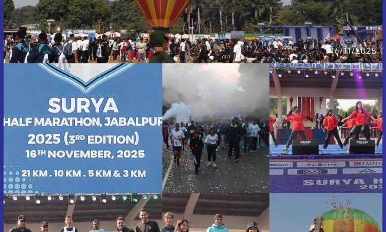 मनीष श्रीवास जबलपुर दर्पण । मुख्यालय मध्य कमान के तत्वावधान में जबलपुर के मध्य भारत एरिया द्वारा 16 नवंबर 2025 को मध्य प्रदेश के कोबरा ग्राउंड से सूर्या हाफ मैराथन के तीसरे संस्करण का भव्य आयोजन किया गया। यह कार्यक्रम मध्य भारत और जबलपुर के नागरिकों की प्रतिभा को निखारने और उनकी सकारात्मक ऊर्जा को निर्देशित करने के लिए एक गतिशील मंच प्रदान करता है। सूर्या हॉफ मैराथन का शुभारंभ मध्य प्रदेश के मुख्यमंत्री डॉ मोहन यादव ने वर्चुअल माध्यम से किया। इस अवसर पर मुख्य अतिथि लेफ्टिनेंट जनरल अनिंद्य सेनगुप्ता, जनरल ऑफिसर कमांडिंग-इन-चीफ, मध्य कमान और श्रीमती रुचिरा सेनगुप्ता, क्षेत्रीय अध्यक्षा आवा, मध्य कमान के साथ–साथ लेफ्टिनेंट जनरल पीएस शेखावत, जनरल ऑफिसर कमांडिंग, मध्य भारत एरिया, श्रीमती राजलक्ष्मी शेखावत, जोनल अध्यक्षा आवा, मध्य भारत एरिया, श्रीमती सुनीता गोदारा, अंतरराष्ट्रीय मैराथन धावक और जबलपुर के मेयर जगत बहादुर सिंह अन्नू सहित अन्य गणमान्य व्यक्ति उपस्थित रहे। मैराथन की प्रत्येक श्रेणी को कोबरा ग्राउंड से अलग-अलग समय पर शुरू किया गया, जिसे लेफ्टिनेंट जनरल सेनगुप्ता, श्रीमती रुचिरा सेनगुप्ता, लेफ्टिनेंट जनरल पीएस शेखावत श्रीमती राजलक्ष्मी शेखावत और जबलपुर के महापौर जगत बहादुर सिंह अन्नू सहित शहर के अन्य गणमान्य व्यक्तियों द्वारा झंडी दिखाकर शुरू किया गया । विभिन्न आयु समूहों और श्रेणियों के उत्साही धावकों ने जबलपुर शहर के हरे-भरे वातावरण में 21 किलोमीटर, 10 किलोमीटर और 5 किलोमीटर व 3 किलोमीटर की दौड़ में हिस्सा लिया। प्रत्येक श्रेणी में पोडियम फिनिशरों को कुल 15 लाख रुपये के पुरस्कारों से सम्मानित किया गया। सूर्या हाफ मैराथन के लिए ओपन श्रेणी में एक लाख रुपये के नकद पुरस्कार के साथ प्रथम स्थान कृष्णाराम (पुरुष वर्ग) और भारती यादव (महिला वर्ग) ने जीता। 10 किलोमीटर दौड़ के लिए पचास हजार रुपये का नकद पुरस्कार हर्षपुरी गोस्वामी (पुरुष वर्ग) और डिंपल सिंह (महिला वर्ग) ने ओपन श्रेणी में जीता और 5 किलोमीटर के लिए बीस हजार रुपये का नकद पुरस्कार जोगिंदर सिंह (पुरुष वर्ग) और पूजा यादव (महिला वर्ग) ने जीता । इसके अतिरिक्त प्रत्येक आयु वर्ग और दौड़ श्रेणी में सभी विजेता प्रतिभागियों को लाखों के पुरस्कार वितरित किए गए। सभी प्रतिभागियों को उनकी प्रतिस्पर्धी भावना को पहचानते हुए फिनिशर मेडल प्रदान किए गए। भारतीय सेना की माइक्रोलाइट टीम ने हवाई कर्तव् दिखते हुए धावकों और दर्शकों के ऊपर पुष्प वर्षा करते हुए सभी उपस्थित लोगों का उत्साहवर्धन भी किया। धावकों के लिए हथियारों और उपकरणों की प्रभावशाली श्रृंखला भी प्रदर्शित की गई । सूर्या हाफ मैराथन कार्यक्रम को और रोमांचित बनात