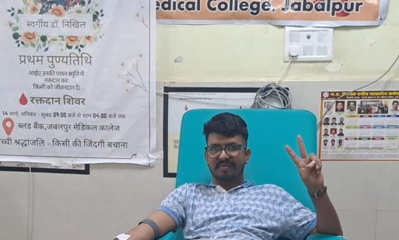 मनीष श्रीवास जबलपुर दर्पण । जबलपुर जिले में मानवता की मिसाल एवं जरूरत में रक्तदान करके युवा ने एक मिसाल खड़ी की हैं। कहते हैं कि जीवन के अमूल्य की जरूरत है रक्त, जीवन में मानवता की मिसाल है ये शक्त, रक्तदान महादान जी हा हम बात करतें इस युवा की जिन्होंने मानवता की मिसाल पेश करते हुए पंडित कार्तिकेय तिवारी, संस्थापक स्व.श्रीमती शकुंतला तिवारी स्मृति सेवा समिति, ने ब्लड बैंक मेडिकल कॉलेज जबलपुर में एक दुर्घटना पीड़ित मरीज गोविंद के लिए रक्तदान किया। यह रक्तदान स्वर्गीय डॉ. निखिल की पावन स्मृति में किया गया। जिससे उनके सेवा और मानवता के मूल्यों को श्रद्धांजलि दी गई। इस प्रेरणादायक पहल के माध्यम से समाज में स्वैच्छिक रक्तदान के प्रति जागरूकता का संदेश भी दिया गया।