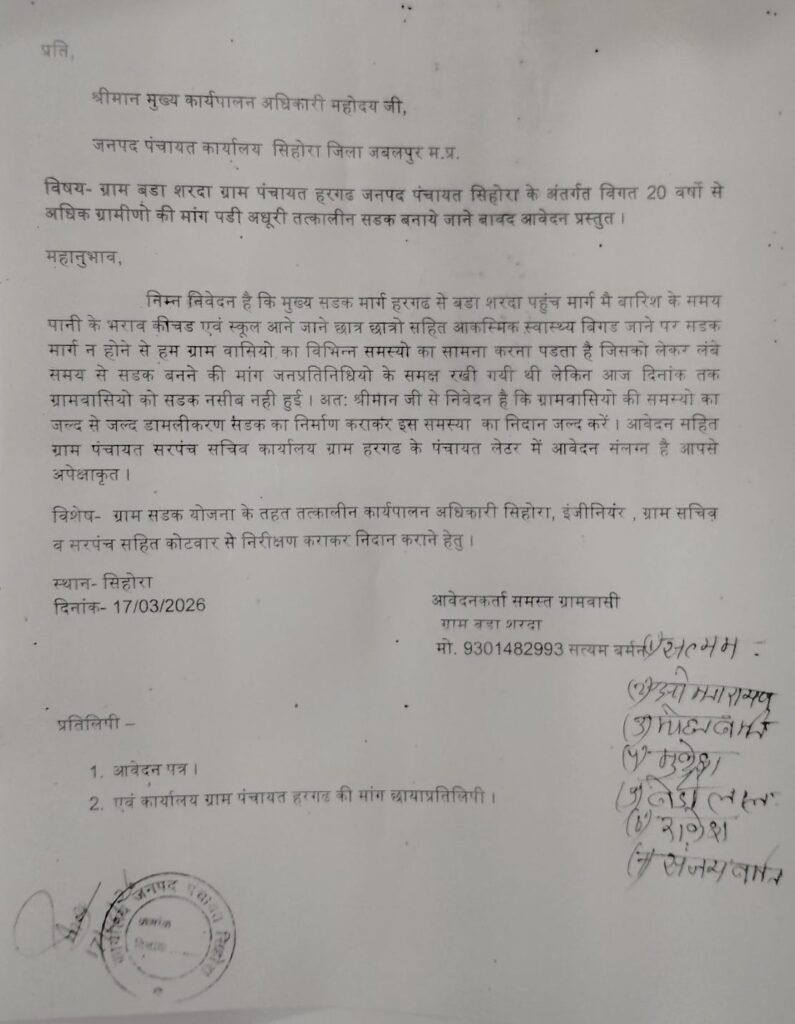 मनीष श्रीवास जबलपुर दर्पण । सिहोरा जनपद पंचायत क्षेत्र अंतर्गत ग्राम पंचायत हरगढ़ के ग्राम बड़ा शारदा के ग्रामीण पिछले 20 वर्षों से सड़क सुविधा के अभाव में परेशान हैं। मूलभूत सुविधा से वंचित ग्रामीणों ने मंगलवार को तहसील मुख्यालय सिहोरा पहुंचकर जनप्रतिनिधियों एवं प्रशासन के नाम आवेदन प्रस्तुत कर सड़क निर्माण की मांग की। ग्रामीणों ने बताया कि हरगढ़ मुख्य सड़क मार्ग से लगभग 4 किलोमीटर दूर स्थित बड़ा शारदा गांव तक पहुंचने के लिए आज भी कोई पक्का सड़क मार्ग उपलब्ध नहीं है। बरसात के मौसम में यह मार्ग कीचड़, दलदल और जलभराव से पूरी तरह बाधित हो जाता है, जिससे आवागमन अत्यंत कठिन हो जाता है। ग्रामवासियों ने आवेदन पत्र के माध्यम से क्षेत्रीय विधायक, अनुविभागीय अधिकारी (एसडीएम) सिहोरा तथा जनपद पंचायत के मुख्य कार्यपालन अधिकारी से मांग की है कि शीघ्र ही डामरीकरण सड़क का निर्माण कराया जाए। आवेदन ग्राम पंचायत हरगढ़ के सरपंच एवं सचिव के माध्यम से भी प्रस्तुत किया गया है। ग्रामीणों का कहना है कि सड़क नहीं होने से सबसे अधिक परेशानी स्कूली छात्र-छात्राओं और बीमार व्यक्तियों को होती है। आकस्मिक स्थिति में मरीजों को अस्पताल तक पहुंचाना बेहद कठिन हो जाता है, जिससे गंभीर खतरे की स्थिति बन जाती है। ग्रामीणों ने बताया कि वे वर्षों से जनप्रतिनिधियों के समक्ष सड़क निर्माण की मांग उठाते आ रहे हैं, लेकिन आज तक समस्या का समाधान नहीं हो सका है। अब एक बार फिर उन्होंने प्रशासन से जल्द से जल्द सड़क निर्माण कार्य प्रारंभ कराने की मांग की है, ताकि ग्रामवासियों को बुनियादी सुविधा मिल सके।