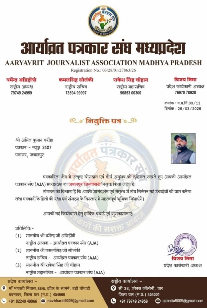 अमित परौहा बने आर्यवृत पत्रकार संघ के जबलपुर जिला अध्यक्ष, पत्रकार साथियों ने दी शुभकामनाएं