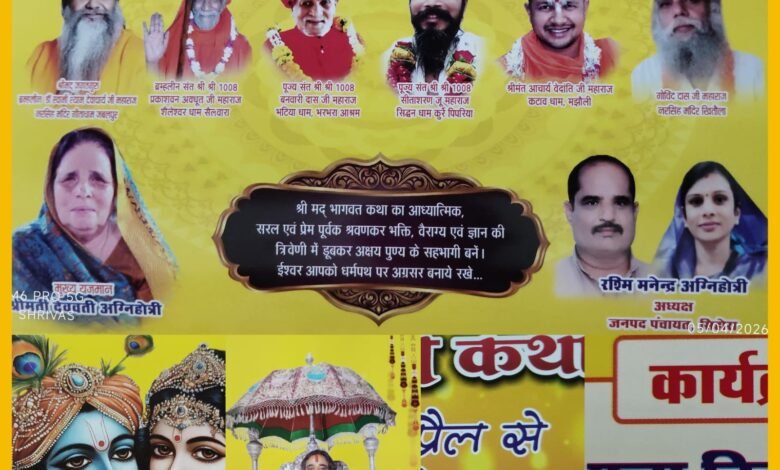 मुख्य कार्यक्रम में- परम पूज्य श्रीमद् जगतगुरु ब्रह्मलीन डॉक्टर स्वामी श्याम देवाचार्य जी महाराज नरसिंह मंदिर गीता धाम जबलपुर, ब्रह्मलीन संत श्री श्री 1008 प्रकाश वन अवधूत जी महाराज शैलेश्वर धाम सेलवारा, पूज्य संत श्री श्री 1008 बनवारी दास जी महाराज भाटिया धाम भरभरा आश्रम सिहोरा,परम पूज्य संत श्री श्री 1008 सीता शरण जी महाराज लोड़ा पहाड़ सिद्धन धाम कुर्रे पिपरिया सिहोरा,श्रीमंत आचार्य वेदांती जी महाराज कटाव धाम मझौली, गोविंद दास जी महाराज नर्सिंह मंदिर खितौल सिहोरा के आशीर्वाद से एवं श्री हरि ओम नमो भगवते वासुदेवाय नमः कृष्णाय वासुदेवकी नंदनाय च। नंदगोप कुमाराय गोविंदाय नमो नमः के आशीर्वाद से होने जा रहीं श्रीमद् भागवत कथा में मुख्य यजमान श्रीमति देववती अग्निहोत्री की मौजूदगी में की जायेगी। भव कलश यात्रा – सोमवार दिनांक 6 अप्रैल को कलश यात्रा शाम 4:00 बजे शिव मंदिर बाबा ताल से कार्यक्रम स्थल प्रज्ञा विहार कॉलोनी के लिए प्रस्थान करेगी। कार्यक्रम निम्न प्रकार से सोमवार 6 अप्रैल 2026 को कलश यात्रा शाम 4:00 बजे देव आराधना व्यास पूजन एवं भागवत कथा महंत परम। मंगलवार 7 अप्रैल 2026 को मंगलाचरण रौनक प्रश्न कुंती स्तूति परीक्षित जन्म कली निग्रह सुखदेव आगमन। बुधवार 8 अप्रैल 2026 सृष्टि रचना कपिल गीता बाराह अवतार सती चरित्र ध्रुव चरित्र। गुरुवार 9 अप्रैल 2026 मत्स्य चरित्र अजामिल उपाख्यान नरसिंह अवतार वामन अवतार श्री कृष्ण जन्मोत्सव। शुक्रवार 10 अप्रैल 2026 नंदोत्सवों पूतना वध श्री कृष्णा बाल लीला गोवर्धन पूजन। शनिवार 11 अप्रैल 2026 महारास कृष्ण बलराम मधुर गमन कंस वध श्री कृष्ण रुक्मणी विवाह। रविवार 12 अप्रैल 2026 सुदामा चरित्र परीक्षित मोक्ष कथा विश्राम पूर्णाहुति एवं चार धाम हवन। सोमवार 13 अप्रैल 2026 भंडारा एवं महाप्रसाद वितरण समय दोपहर 2:00 बजे से आपके आगमन तक। निवेदन एवं आग्रह करता – निवेदन करता श्रीमती रश्मि मनेंद्र अग्निहोत्री जनपद पंचायत अध्यक्ष सिहोरा शैलेंद्र अग्निहोत्री पंकज अग्निहोत्री सारांश अग्निहोत्री के साथ अग्निहोत्री परिवार।आग्रह करता- नरेंद्र कुमार अग्निहोत्री रघुनाथ अग्निहोत्री देवेंद्र अग्निहोत्री संतोष अग्निहोत्री समीर अग्निहोत्री शिव शक्ति अग्निहोत्री अनित अग्निहोत्री वैभव अग्निहोत्री सचिन अग्निहोत्री अनुज अग्निहोत्री एवं समस्त अग्निहोत्री परिवार।