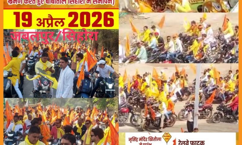 मनीष श्रीवास जबलपुर दर्पण । जबलपुर जिले के सिहोरा नगर में भगवान विष्णु के छठे अवतार ब्राह्मण समाज के आराध्य देवता भगवान परशुराम के प्रगटोत्सव पर रविवार की सुबह 9 बजे नृसिंह मंदिर खितौला से भक्ति भाव के साथ विशाल वाहन रैली निकाली गई। 19 अप्रैल 2026 दिन रविवार को अक्षय तृतीय एवं परशुराम प्राकट्योत्सव के शुभ अवसर पर शिव मंदिर बाबाताल में संयुक्त ब्राह्मण समाज सिहोरा के द्वारा खितौला व सिहोरा में नगर भ्रमण करते हुए रैली बाबा ताल शिव मंदिर में आकर भगवान परशुराम की आरती के साथ रैली का समापन किया गया। लगातार विगत कई वर्षों से सिहोरा खितौला के समस्त विप्रजनों द्वारा मिलकर वाहन रैली निकाली जा रहीं है । शिव मंदिर में भंडारे का किया गया आयोजन। दिन भर चलेंगे अनेक कार्यक्रम। रथ में सवार परम पूज्य संत आकर्षक महाराज के सानिध्य में रैली सहित अन्य कार्यक्रम आयोजित किए जा रहे हैं । वाहन रैली निकली इन इन जगहों से – वाहन रैली रविवार 19 अप्रैल 2026 की सुबह 9 बजे के दौरान नृसिंह मंदिर खितौला से प्रारम्भ होकर रेलवे फाटक,खितौला बाजार, पेट्रोल पंप तिराहा से आकर बाबाताल,हरदौल मंदिर,मैना कुआं, सरावगी मोहल्ला, काल भैरव चौक, झंडा बाजार, आजाद चौक,गौरी तिराहा, पुराना बस स्टेंड से होकर शिव मंदिर बाबाताल में समापन की गई । संयुक्त ब्राह्मण समाज ने सभी विप्रजनों का आभार व्यक्त किया। और वाहन रैली को सफल बनाने के साथ साथ उपस्थिति ब्राह्मण समाज को भी प्रेरित किया।