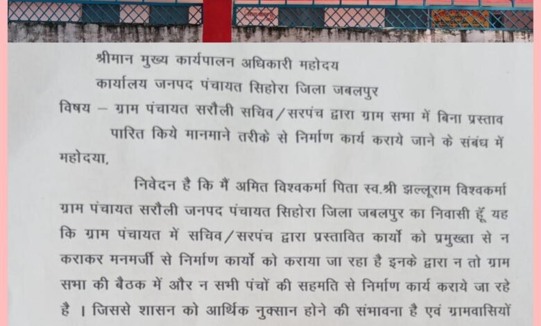 आवेदन कर्ता ने मीडिया को जानकारी देते हुए बताया कि ग्राम पंचायत सरौली के सचिव/सरपंच द्वारा साठगांठ कर ग्राम सभा में बिना प्रस्ताव पारित किये मानमाने तरीके से निर्माण कार्य कराये जाने के संबंध में ग्राम के निवासी अमित विश्वकर्मा द्वारा जनपद पंचायत कार्यालय मुख्य कार्यपालन अधिकारी सिहोरा को पत्र देकर मांग की गई है। कि ग्राम पंचायत में सचिव/सरपंच द्वारा प्रस्तावित कार्यो को प्रमुख्ता से न कराकर मनमर्जी तरीके से निर्माण कार्यो को कराया जा रहा है। इनके द्वारा न तो ग्राम सभा की बैठक में और न सभी पंचों की उपस्थिति सहमति से निर्माण कार्य कराये जा रहे है । जिससे शासन को आर्थिक नुक्सान होने की संभावना भी अधिक हो रहीं है । एवं ग्रामवासी उचित लाभ से वंचित भी हो रहे है। आवेदन के माध्यम से शिकायतकर्ता द्वारा अतिशीघ्र अधिकारियों को संज्ञान लेकर जांच कर कार्यवाही की मांग रखीं हैं।