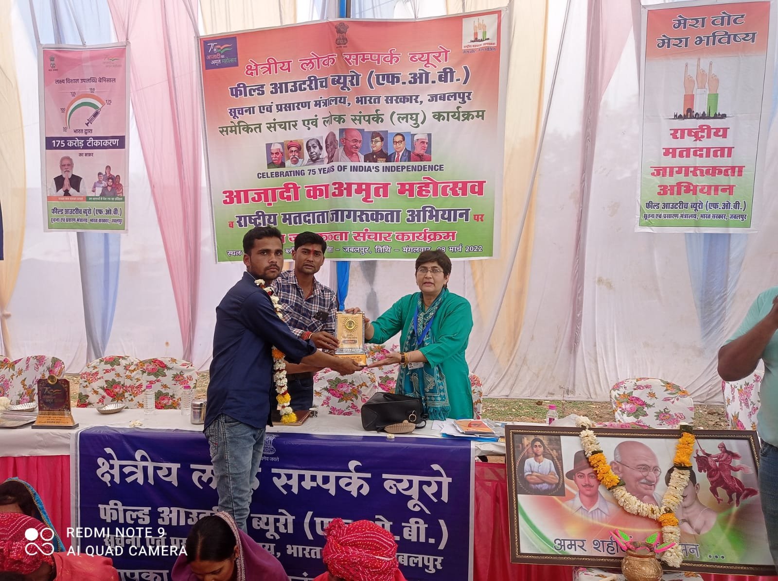 मझौली संवाददाता। फील्ड आउटरीच ब्यूरो सूचना प्रसारण मंत्रालय भारत सरकार जबलपुर द्वारा दैनिक जबलपुर दर्पण के पत्रकार को किया सम्मानित ग्राम पंचायत सगोड़ी में आयोजित कार्यक्रम में नेहरू युवा केंद्र जबलपुर के तत्वधान में सूचना प्रसारण मंत्रालय के अधिकारी वर्षा शुक्ला ने दैनिक जबलपुर दर्पण संवाददाता ओम प्रकाश साहू को सम्मानित किया तथा जबलपुर दर्पण के संपादक अनिल सैन की भी सराहना की और जबलपुर दर्पण समाचार के उज्जवल भविष्य की कामना की।