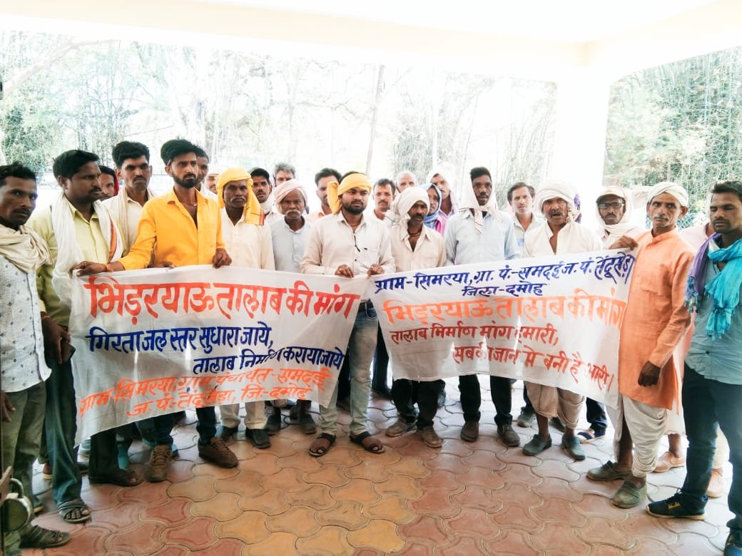 जबलपुर दर्पण जबेरा संवाददाता। भगवत सिंह लोधी की रिपोर्ट। जिले के तेदूखेडा तहसील से 45 किलोमीटर दूर तेंदूखेड़ा ब्लॉक के अंतर्गत आने वाली ग्राम पंचायत समदई के अंतर्गत आने वाला टोला ग्राम सिमरया के समीप स्थित जंगल में वन विभाग की भूमि पर एक जंगली नाला है जो कि बहुत ही बड़ा नाला है जिसमें तालाब बन जाए तो उस तालाब पर तकरीबन 3 से 4 हेक्टेयर का भूमि में पानी का भराव होगा और वहां के आसपास चार ग्रामों के किसानों एवं घरेलू मवेशियों एवं जंगली जानवरों के लिए पीने योग्य भरपूर मात्रा में पानी प्राप्त होगा लेकिन यहां के ग्रामीणों द्वारा कई वर्षों से मांग की जा रही है जिस मांग को लेकर अधिकारियों एवं जनप्रतिनिधियों द्वारा केवल आश्वासन मिलता है लेकिन उनकी मांग को पूरा नहीं किया गया। इस तर्मताय में आज ग्राम पंचायत समदई के ग्राम सिमरया से बड़ी संख्या में लोग ट्रैक्टर मोटरसाइकिल से ग्रामीण जन बड़ी संख्या में कलेक्ट्रेट कार्यालय दमोह पहुंचकर कलेक्टर महोदय के नाम ज्ञापन सौंपा और अपनी मुख्य मांग जल संकट से जूझ रहे तीन ग्रामों के लोगों ने ज्ञापन में उल्लेख किया कि हमारे गांव के पास जंगली नाले पर एक बड़ा तालाब बनवाया जाए जिसके लिए सभी ग्राम वासियों ने अपनी सहमति देकर कलेक्टर साहब से गुहार लगाई कि कृपया कर महोदय जी इस मांग को जल्द से जल्द स्वीकृत कराकर तालाब निर्माण करवाया जाए जिससे हम एवं हमारे गांव के और आसपास के ग्रामीण जनों को इस जल का लाभ मिले और जो बंजर भूमि है उसको भी सिंचित बनाया जा सके जिससे हम लोग अपनी खेती को धंधे का लाभ बना सकें और हम लोग बूंद बूंद पानी के लिए तरस रहे हैं संकट से जूझ रहे हैं बड़ी किल्लत के साथ हम लोग चार माह गर्मी के भीषण गर्मी में निकालते हैं बड़ी मुश्किल से कटते हैं हमारे यहां पालतू जानवरों की भी प्यास के मारे मृत्यु हो जाती है ग्रामीण जनों ने अनुरोध किया और कहा गया कि इस समस्या को गंभीरता से अमल में लिया जाए और जल्द से जल्द बड़े स्तर पर तालाब निर्माण कराया जाएं। अगर इस समस्या पर अमल नहीं करते तो आगे यहां पर आकर महिलाओं के साथ मातृशक्ति बच्चे बूढ़े बुजुर्गों के साथ यहां पर धरना देंगे । और भूख हड़ताल करेंगे जिसकी जवाबदारी शासन प्रशासन की होगी। वहीं जंगल की वन भूमि पर तालाब निर्माण कार्य करवाने के लिए माननीय जिला वन मंडल अधिकारी डीएफओ महेंद्र सिंह उइके के नाम से भी एक ज्ञापन प्रेषित किया वहीं ग्रामीणों ने सांसद निवास पहुंचकर वहां सांसद के नाम पर एक आवेदन दिया लेकिन वहां पर सांसद महोदय के न मिलने के कारण उनके वहां पर मौजूद कर्मचारियों को ज्ञापन सौंपकर बेरंग घर की ओर लौटे। सासंद कार्यालय के कर्मचारियों ने बताया सासंद महोदय जबलपुर कार्यक्रम में है। इसके बाद क्षेत्रीय वि